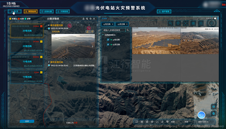 系统具备实时全程监控、火灾预警监测、火情报警、火情定位、录像调取、告警配置等模块,全天候自动巡检光伏场区。